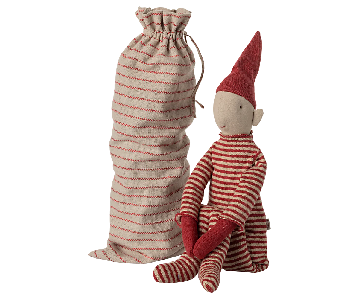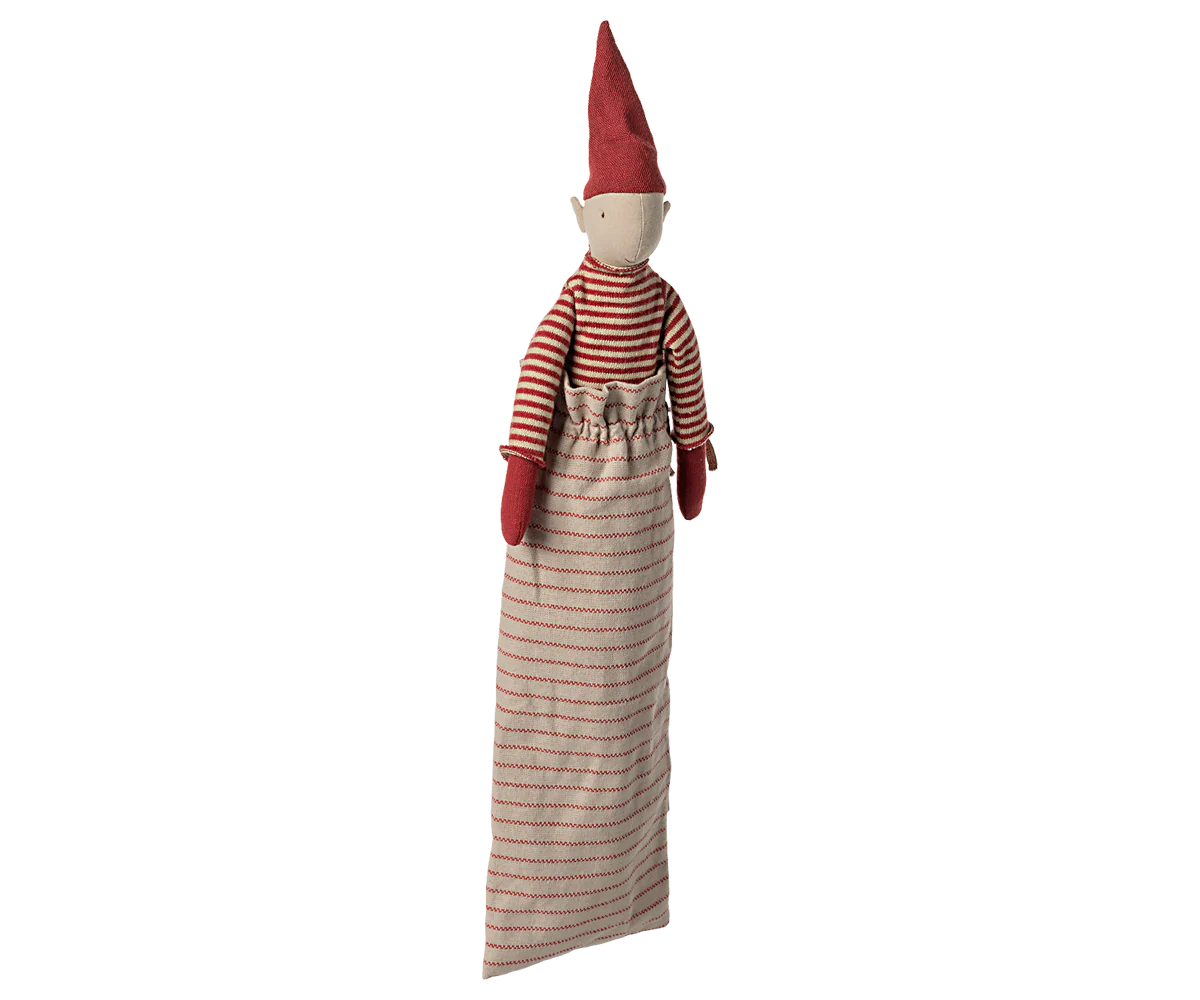 Un pixy dalle gambe lunghe in un morbido abito di maglia, con calamite nelle mani per potersi sedere o appendere ovunque sia adatto. Viene fornito in una morbida borsa di tessuto.